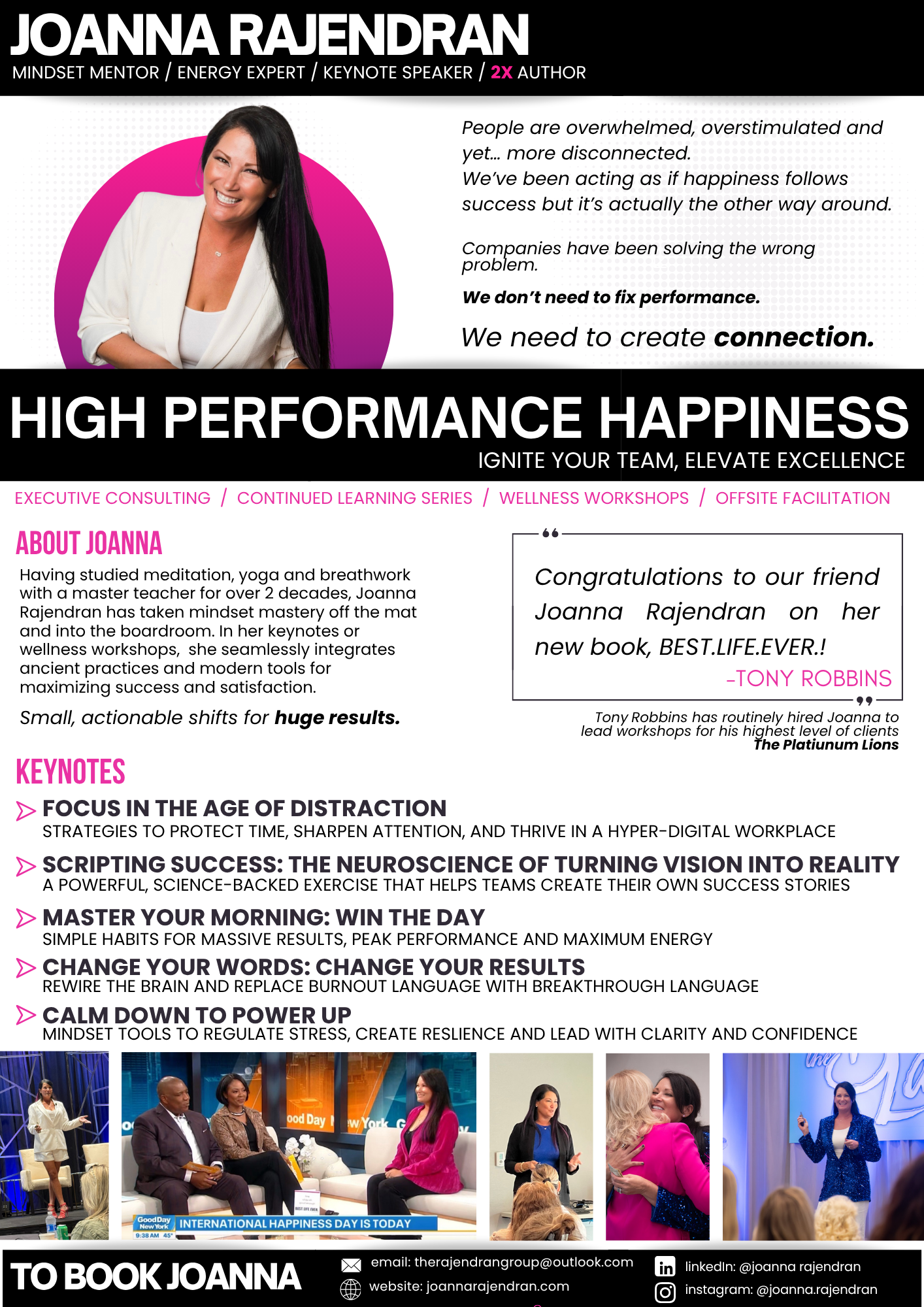 Decades later, I'm absolutely OBSESSED with teaching others how it's possible to stop REACTING to life & begin CREATING it. Utilizing a blend of mindset mastery techniques, breathwork, visualization and inspiration, I provide high level performance mindset mentoring to individuals, communities, corporations, students & athletes. The result- HIGH PERFORMANCE HAPPINESS.